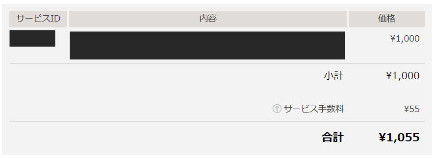 1,000円のサービスを購入すると、55円(5%+外税0.5%)の手数料が請求されています。